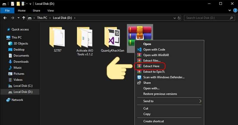 Sau khi tải xong, bạn tiến hành cài đặt bình thường. Đối với những file nén, bạn tiến hành giải nén như sau. Nhấp chuột phải vào tập tin và chọn Extract Here để giải nén tập tin ở thư mục hiện tại